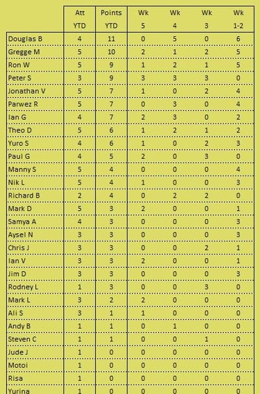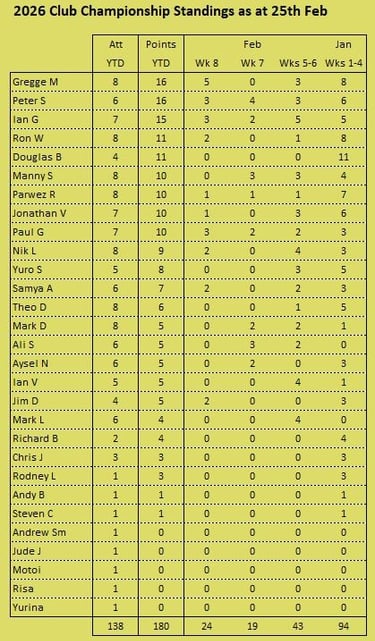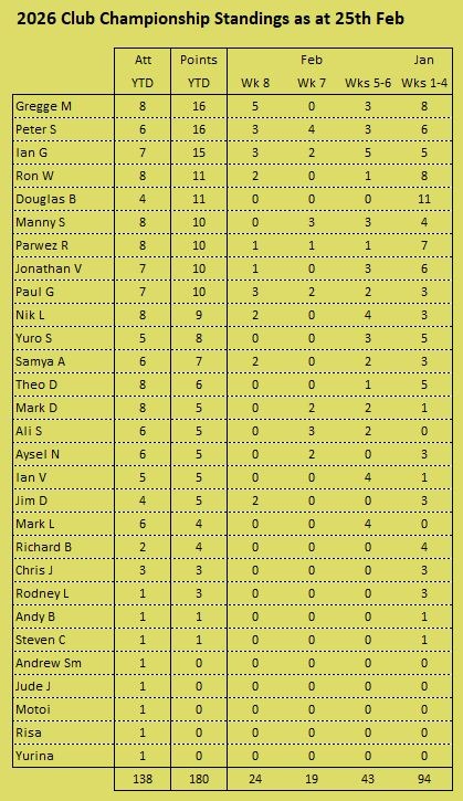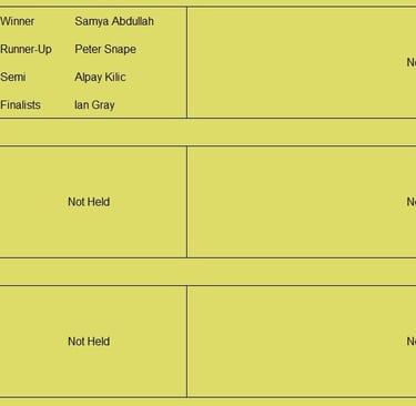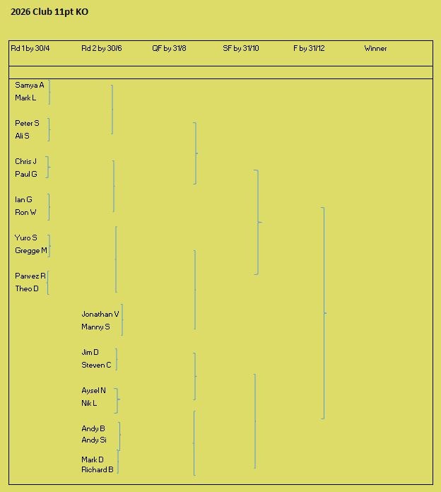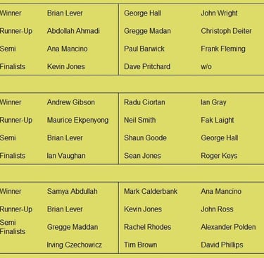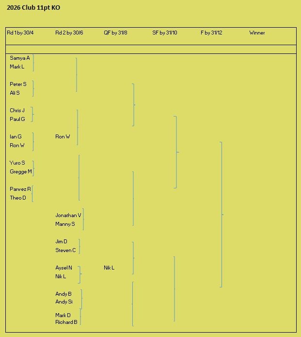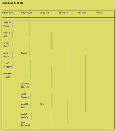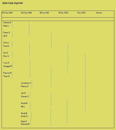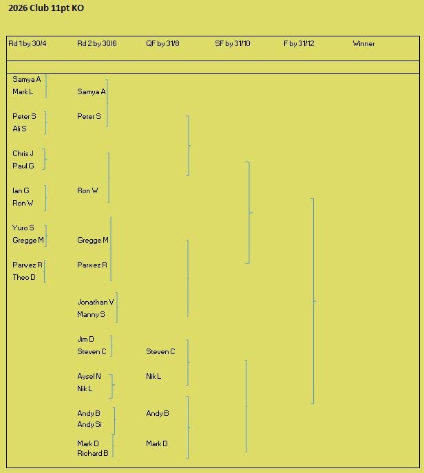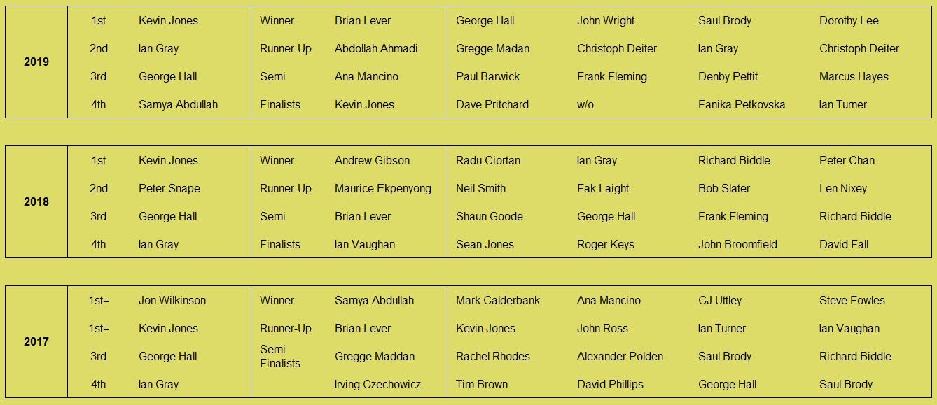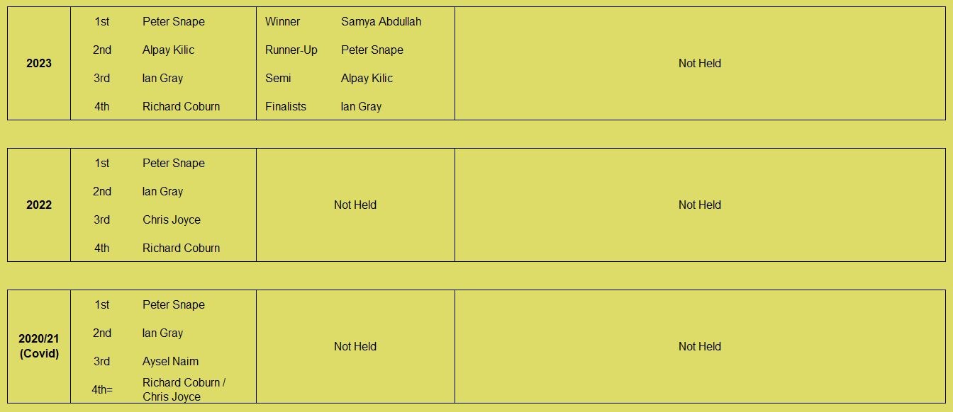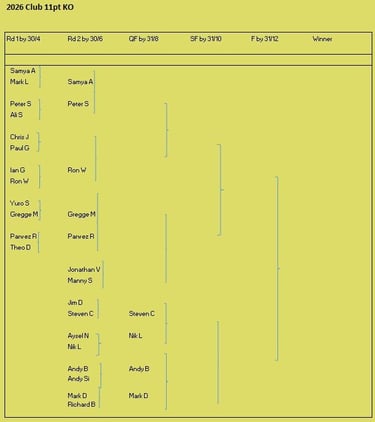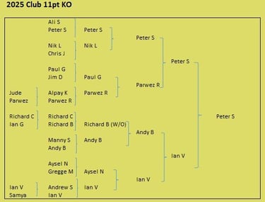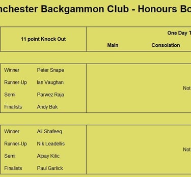 Tournament format is a 3 round KO format (brackets of 8), starting with 5pt matches (using the doubling cube) and reducing to 3pts then 1pt depending on time and number of players left. Once you lose you can enter the next available bracket. You will usually get at least 2 x 5pt matches plus some shorter matches. On the first Tuesday of the month we play a cubeless 2pt KO (1pt round robin no longer played from 2026) which is more suited to beginners. There is no fee to play but we do have optional small pools (£3,£2, £1) with 100% return, default is winner 2/3 runner-up 1/3 (or as close as) but finalists may agree a different split. Clocks are not generally used but may be imposed on very slow players if they are holding up a bracket. All tournaments count towards the Club Champion Trophy awarded to the player with the most points at the end of the year. 5pt and 3pt match results are input to the UKBGF ratings, you can see the here. There is also an 11 point Knock Out competition, which runs throughout the year (£5 entry).